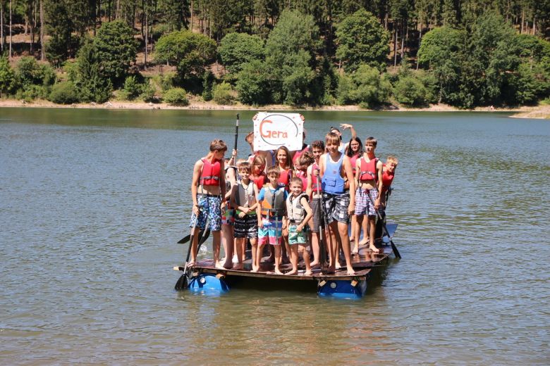 Mit allen Sinnen erforschen die Kinder das Element Wasser am Beispiel des Baches „Jüchnitz“, der hinter dem Schullandheim fließt.