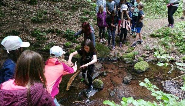 Mit allen Sinnen erforschen die Kinder das Element Wasser am Beispiel des Baches „Jüchnitz“, der hinter dem Schullandheim fließt.