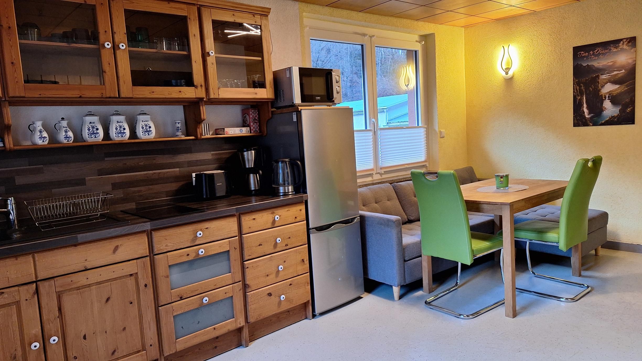 Die kleine Kochniesche ist mit allem ausgestattet, was man so braucht. Kochplatten, Kühlschrank mit Eisfach, Kaffeemaschine, Wasserkocher,... In der Stube steht auch eine Microwelle mit Grillfunktion, sodass Ihr euch alles was ihr möchtet auch zusammen zubereiten könnt.