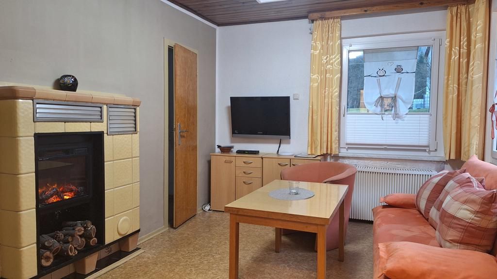 Die Stube besticht durch einen urigen alten Kachelofen, in dem ein schöner Elektrokamin für wohlige Wärme oder die romantische Stimmung sorgen kann.